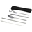 Набір столових приладів, що включає вилку, ніж, ложку, соломинку та щіточку для чищення. Столові прилади виготовлені з довговічної нержавіючої сталі, що легко чиститься. Постачається в поліестеровій сумці на блискавці із зручною петлею для перенесення.