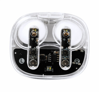 Напівпрозорі бездротові навушники Bluetooth з видимими електронними компонентами та функцією гучного зв'язку. У напівпрозорому пластиковому кейсі-заряднику. В комплект входить кабель USB для зарядного пристрою.